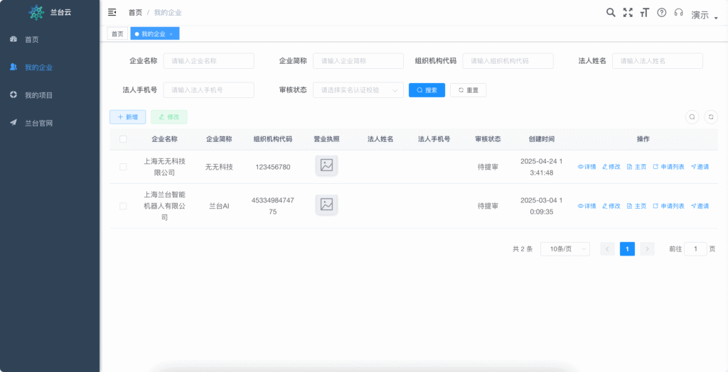 创建人可以【邀请】其他人加入企业。点击【邀请】按钮后,您将自动复制邀请代码。您将此代码发送给被邀请人,引导其完成兰台云的登录(注册),被邀请人将加入到本企业。