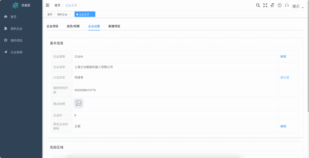 您可以在此处对企业的基本信息进行设置,或提请认证。